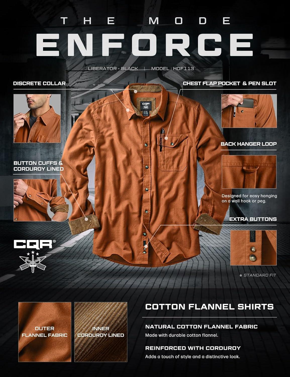 imageCQR Mens 100 All Cotton Button Down Flannel Shirts Long Sleeve Brushed Warm Soft Casual Outdoor Plaid ShirtCorduroy Coal Black