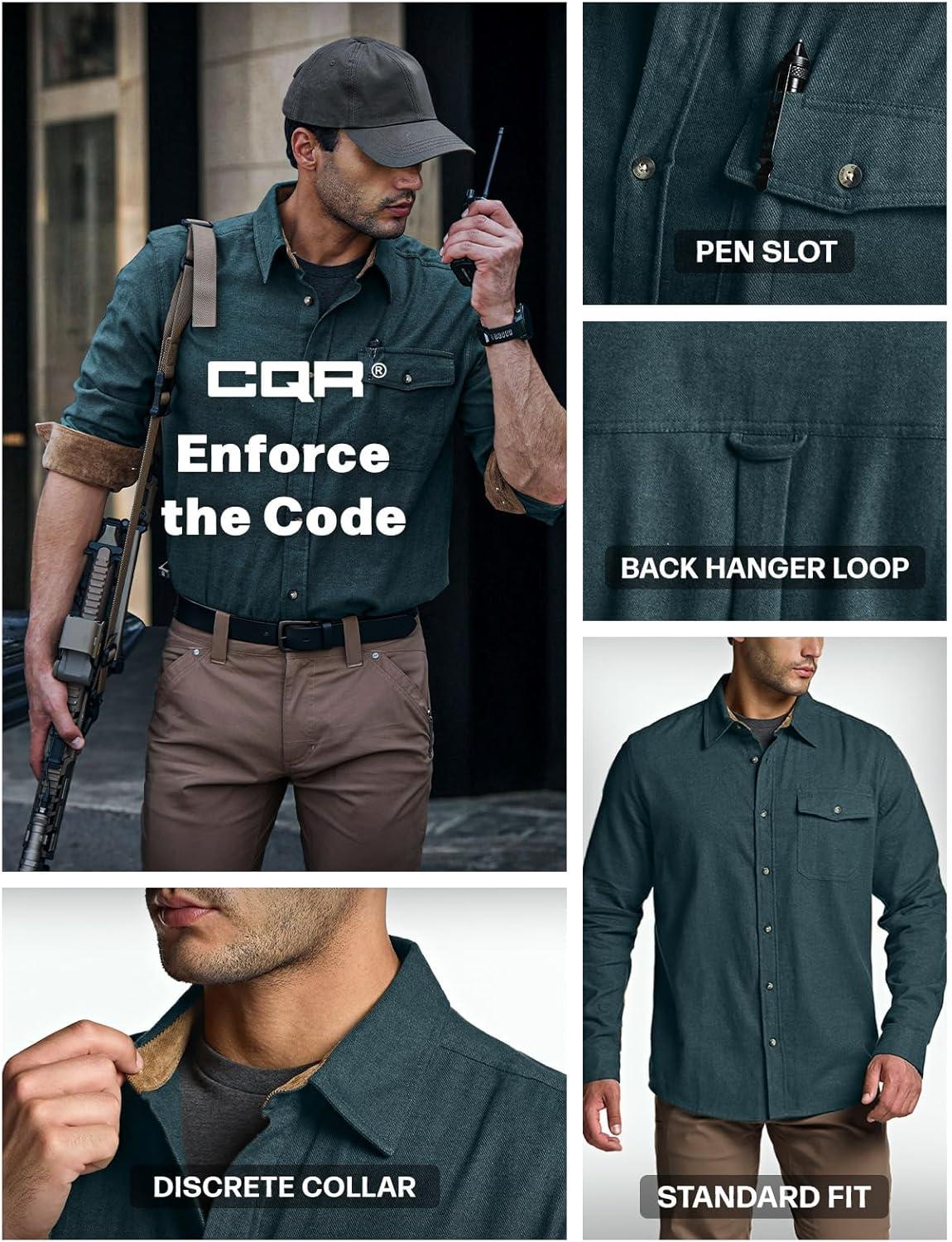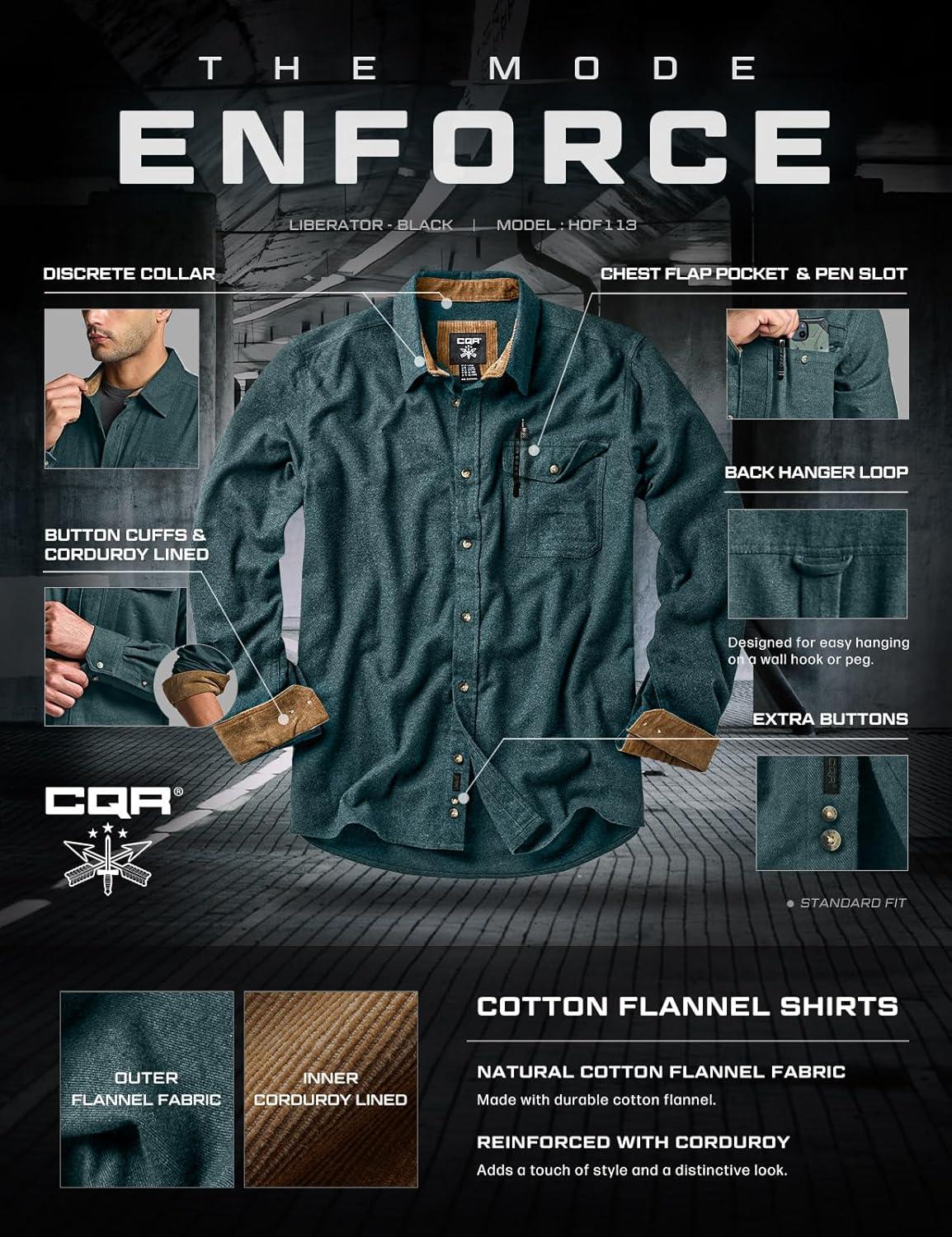 imageCQR Mens 100 All Cotton Button Down Flannel Shirts Long Sleeve Brushed Warm Soft Casual Outdoor Plaid ShirtCorduroy Coal Black