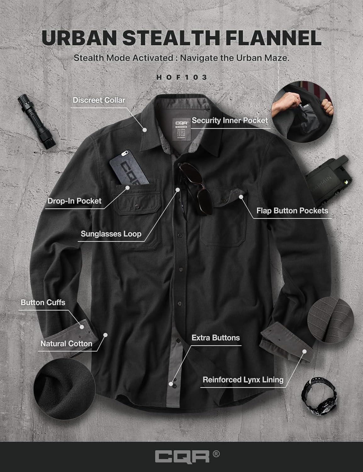 imageCQR Mens 100 All Cotton Button Down Flannel Shirts Long Sleeve Brushed Warm Soft Casual Outdoor Plaid ShirtStealth Coal Miner