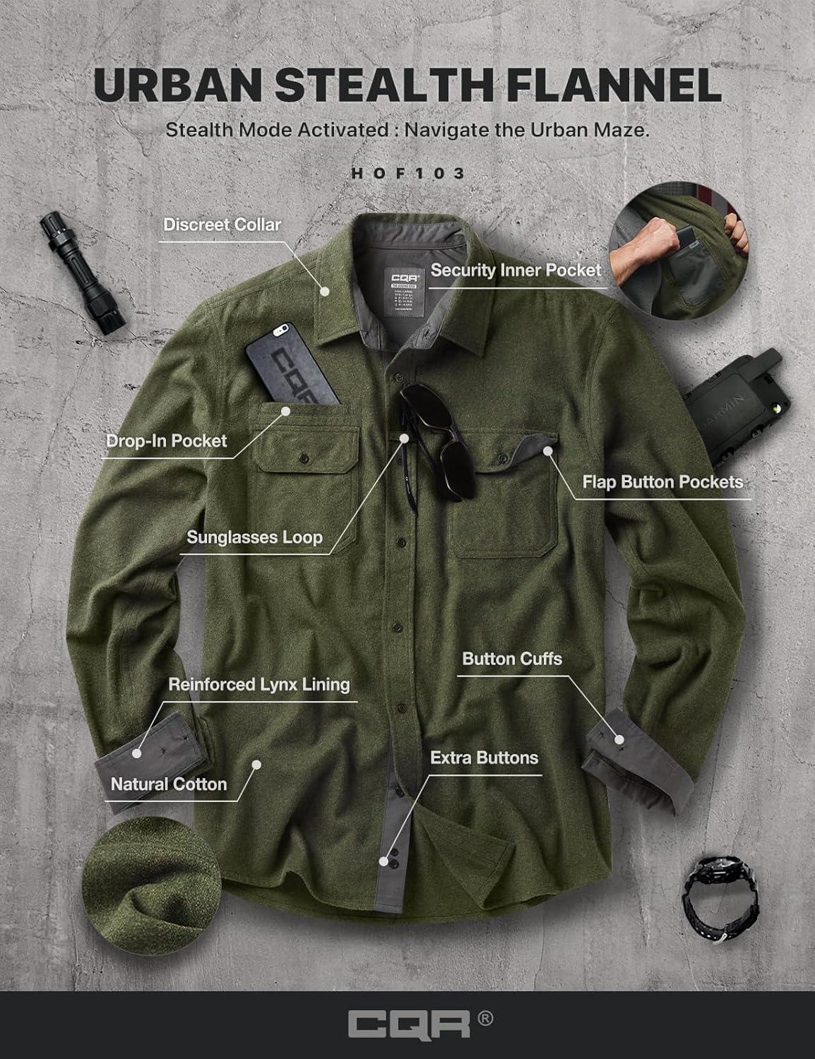 imageCQR Mens 100 All Cotton Button Down Flannel Shirts Long Sleeve Brushed Warm Soft Casual Outdoor Plaid ShirtStealth Solid Hunter Green