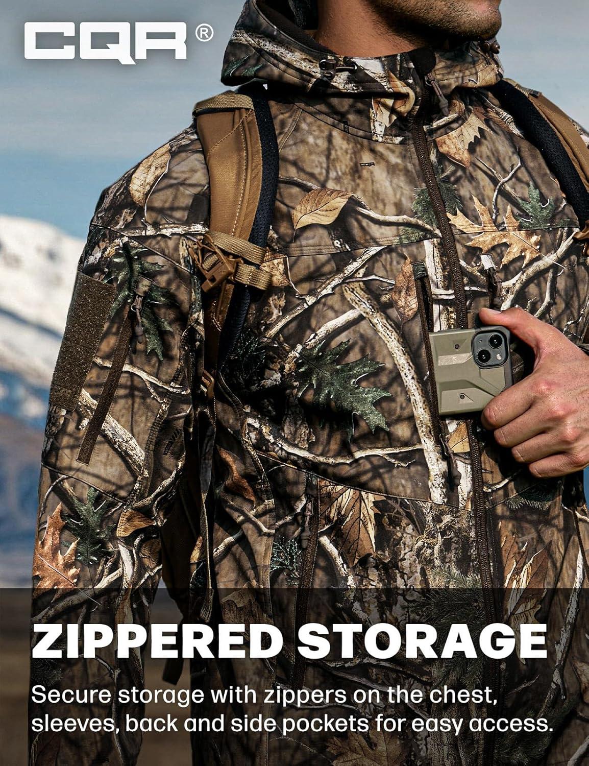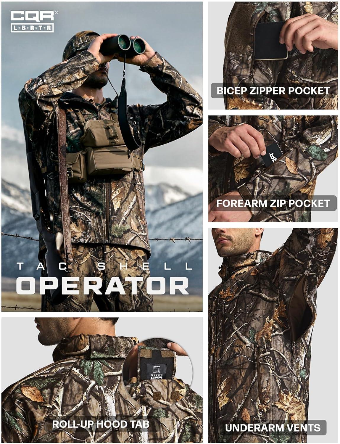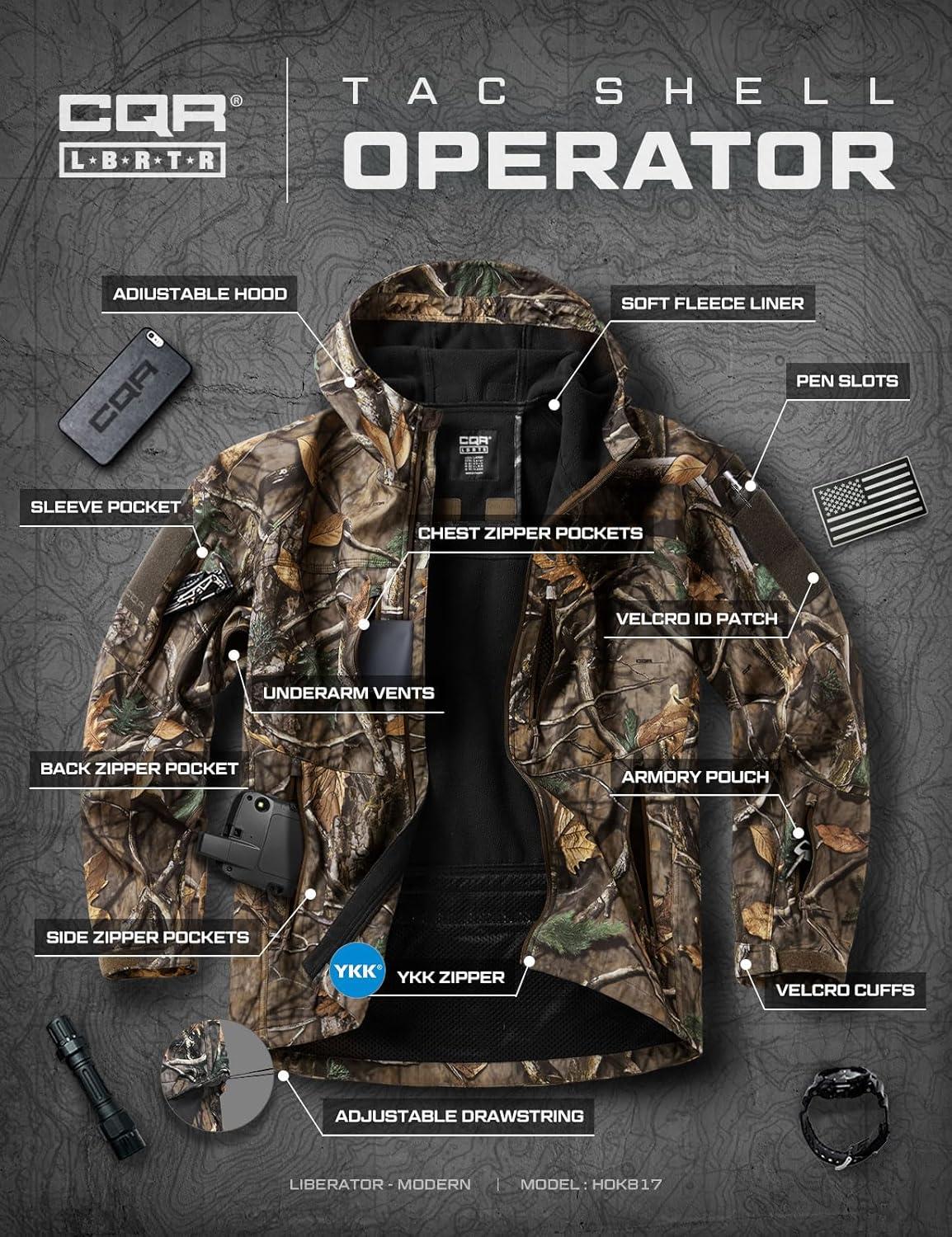 CQR Men's Hooded Tactical Softshell Jacket, Water Resistant Fleece Lined Hoodie, Winter Outdoor Hunting Hiking Rain Wind(Operator Hunting Camo)