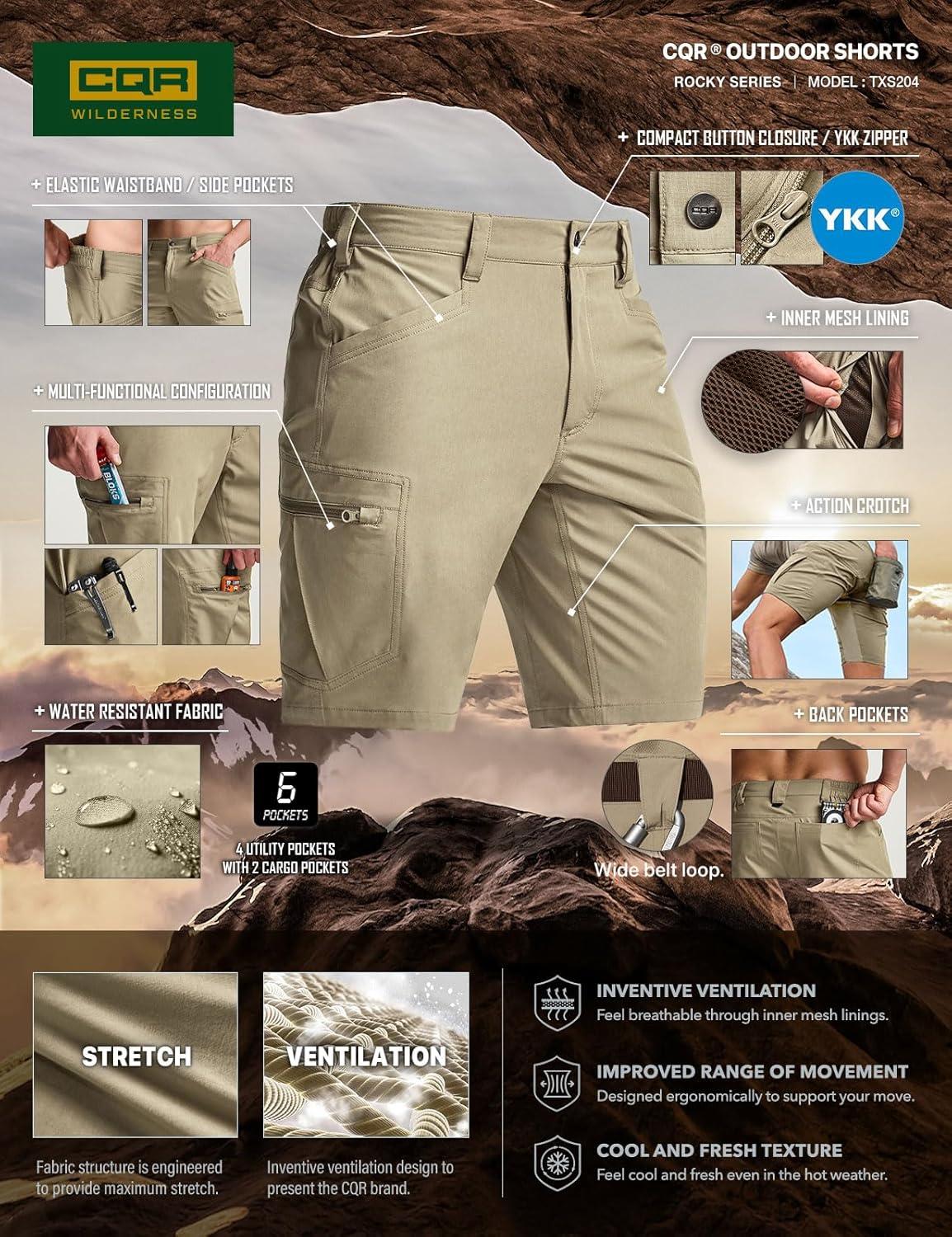 CQR Men’s Quick Dry Stretch Hiking Cargo Shorts, Lightweight Water Resistant Tactical Casual, Golf & Outdoor with Pockets(Rocky Tan)